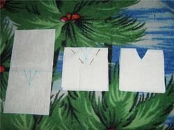 13) Манішку викроюємо 7х14 см., Складаємо прямокутник навпіл і малюємо трикутник. "Витачка" довжиною 1.5 см., і по сантиметру в обидві сторони. Стручуємо, акуратно вирізаємо трикутник, залишаючи припуск 4-5 мм, робимо насічку до куточка, ледь не доходячи до шва. Вивертаємо та обмітаємо краї.