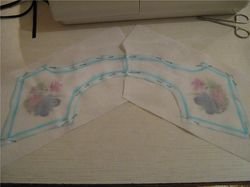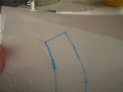 На канві відзначаємо середину і починаємо вишивати. Ось коли вишиєте тоді і почнеться найцікавіше. Під прямокутничок покладіть форму жилетки, так як у нас аїда, то її чудово видно, рухаючи вишивку знайдіть положення, яке вам сподобається. А тепер намалюйте маркером чи олівцем. Потім складіть разом лицьовими сторонами та ідеально поєднайте вишивку і на іншій половинці теж намалюйте контур жилетки