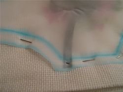 7) а ось тепер ретельно сколюємо на жилетковій стороні, зверніть увагу на мітки, між ними шити не будемо, через отвір, що вийшов, будемо вивертати