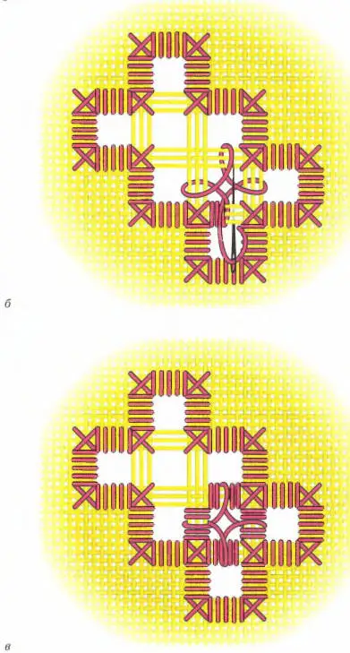 Для початку вишийте по контуру форми шов «качалочки», на кутах •— шов «хрестик» на таку саму кількість ниток тканини (а). Коли всю форму буде обшито, виріжте біля шва «качалочки» нитки тканини, а нитки під швом «хрестик» залиште. Вийде сіточка з ниток тканини всередині форми. Далі заповнюйте сіточку. Закріпіть нитку під хрестиком. Потім почніть навивати качалочку, вводячи голку знизу вгору, під 3 нитки сіточки. Зробіть 2 стібки і починайте вишивання «зірочки» у центрі квадратика.